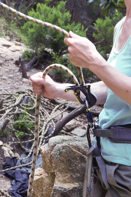 Bei älteren, dickeren Seilen funktioniert es es gut, das Seil von oben ins Sicherungsgerät hineinzuführen.