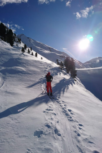Voll beladen für unsere Unternehmung trage ich etwa 13 Kilogramm auf dem Rücken – der einzige Nachteil des kleinen Platzwunders. Aber was mit muss, muss eben mit. Trotz der Traglast fehlt von verspannten Schultern, Nacken- oder Rückenschmerzen auch nach sieben Stunden jede Spur! Ich kann die Lastverteilung sehr gut über die Schulterträger, Brust- und Hüftgurte einstellen. Kein Reiben, kein Drücken, kein Einschneiden der Träger. Dadurch sitzt der Tourenucksack auch beim Abfahren wie angegossen und bringt keine Unruhe in die Bewegung. Mit dem Neo 35+ Skitourenrucksack habe ich ein neues Lieblingsteil für meine Skitour gefunden.