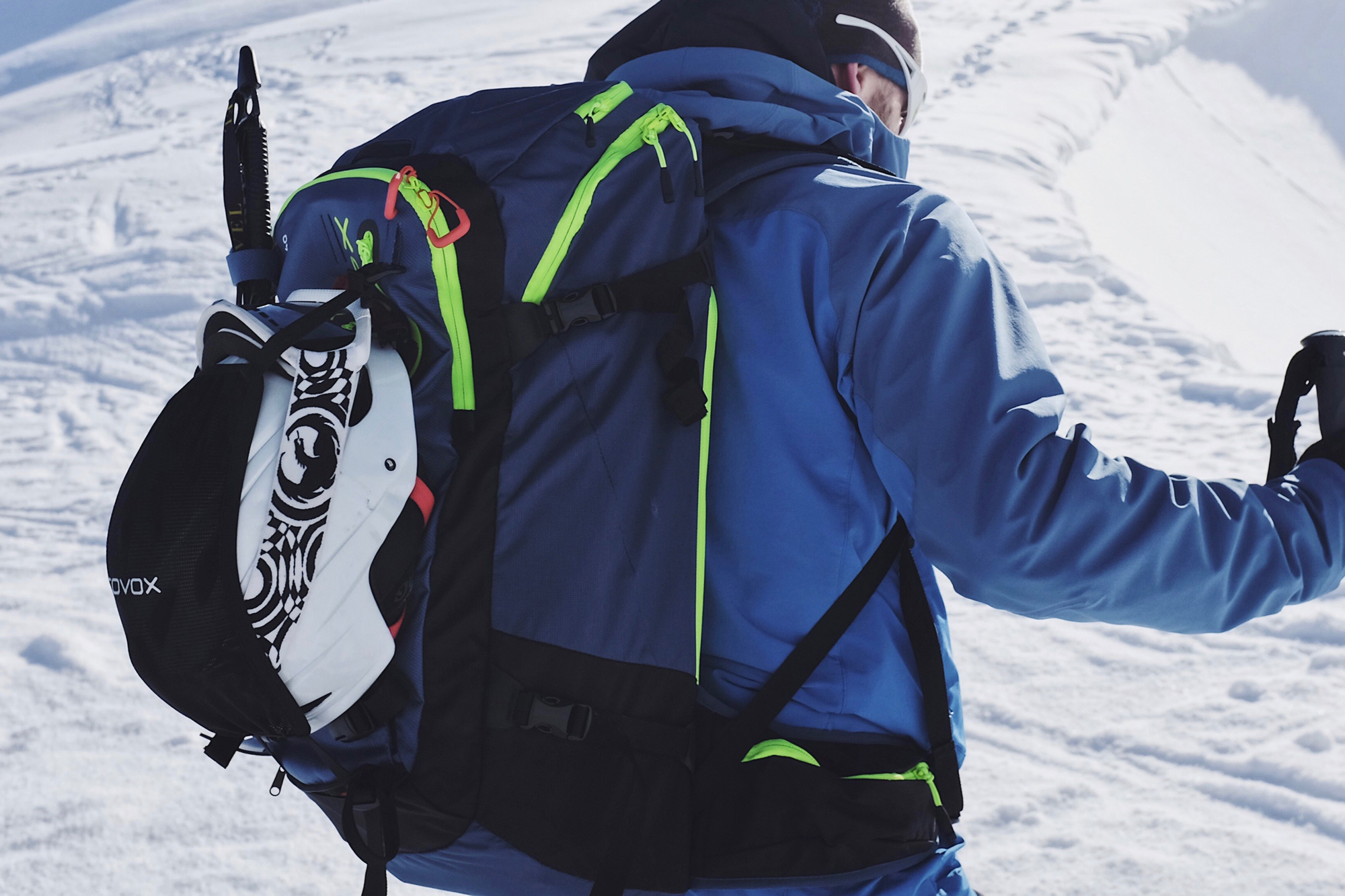 Der Haute Route 40 bietet dafür eine Menge an raffinierter Details. Anfänglich war ich besorgt, ob ich den praktischen Deckel meines bisherigen Modells vermissen werde. Schnell und einfach ließ sich da eine Jacke drunter klemmen. Doch dann erinnere ich mich daran, was mich an ihm in den Wahnsinn trieb: Den Skihelm musste ich mangels entsprechender Vorrichtung mir Karabinern befestigen. Bei Schneefall oder starkem Wind wurde dieser dann aufgrund von fehlendem Schutz regelmäßig eingeschneit. Und wie oft suchte ich verzweifelt nach etwas ganz unten im Rucksack durch den einzigen Zugang von oben. Beim Ortovox Haute Route kein Problem.