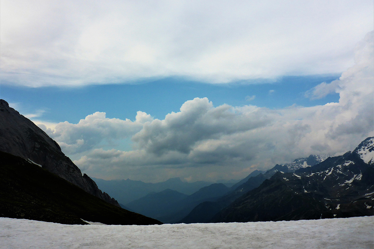 Eine Stunde später blicke ich über den Pass nach Italien: Eine karge Berglandschaft, geschmückt mit weißen Flecken. Das Rifugio Elisabetta ist die erste Unterkunft auf der italienischen Seite. Der Hüttenwart dort teilt mir mit, dass Zelten nicht möglich sei – im Gegensatz zu den im Internet verbreiteten Aussagen. Wer wild campen möchte, sollte vor Ankunft an der Hütte nach geeigneten Plätzen suchen – gemäß den gültigen Regeln (siehe unten).