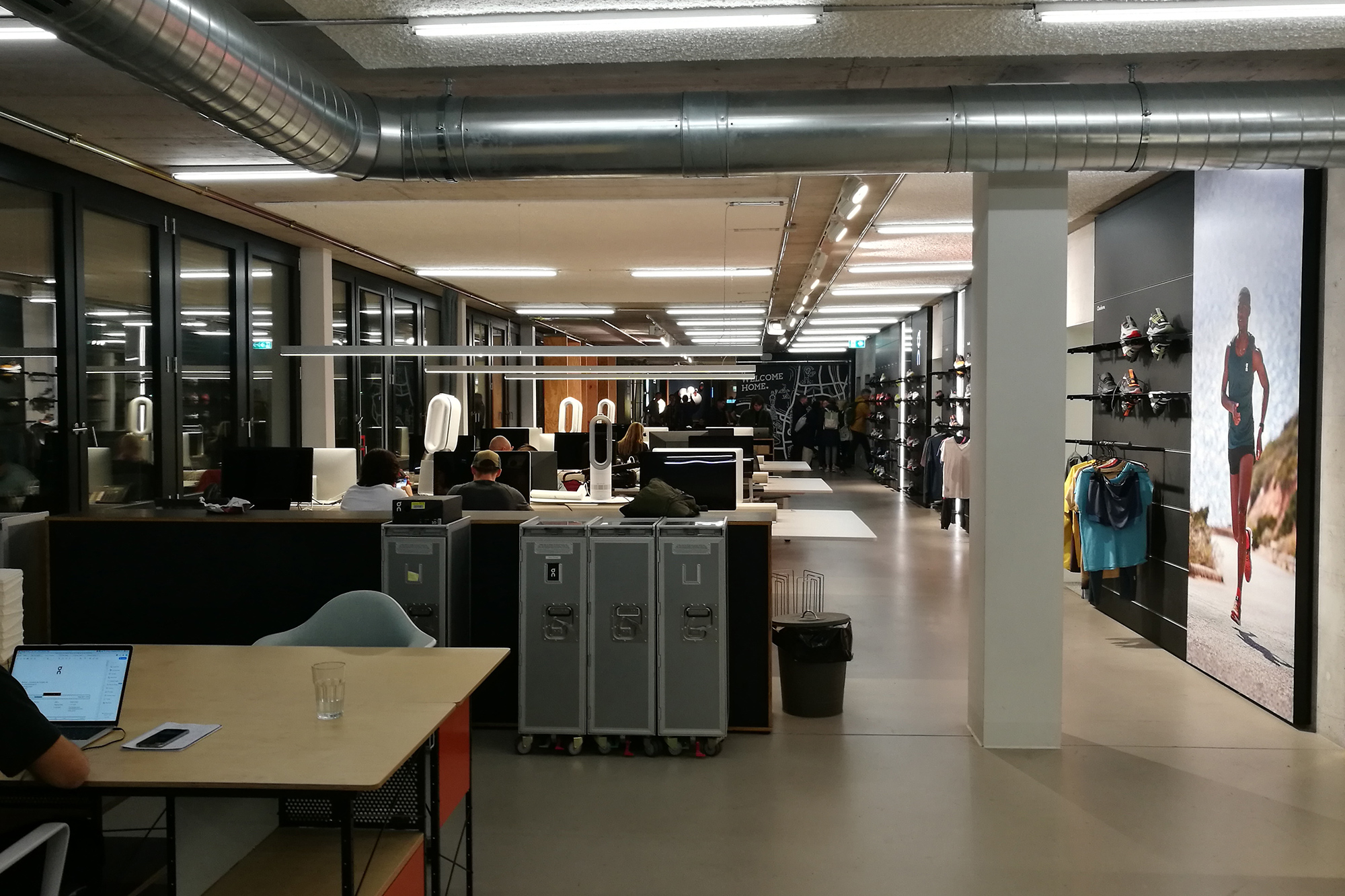 Natürlich werden auch Meetingräume gebraucht, die es in Form unterschiedlich großer, teils durch Glaswände einsehbare Abtrenner gibt – auch ein schalldichter Blackout Room ist dabei. Ursprünglich als On Lab und Fitness-Räume genutzte Bereiche sind nun aufgrund des rasch gestiegenen Bedarfes zu Büroflächen umfunktioniert geworden. Customer Service und Entwicklungslabor sind in den zusätzlich angemieteten Räumen anderer Gebäude untergebracht. Auch hier dürfen wir reinschauen, nutzen die Gelegenheit, um persönliche Ansprechpartner bei Fragen zur Order, Lieferstatus oder zum Mediaportal für Produktbilder und Infos auch persönlich kennenzulernen. Schließlich werden wir noch zur Besichtigung des On Labs eingeladen und staunen unterwegs nicht schlecht, als Caspar Coppetti (Geschäftsführung, Entwicklung, Gründungsmitglied) uns einen größeren Neubau zeigt, der als neue On Firmenzentrale mitten in der City errichtet wird. Immerhin handelt es sich um einen Turm mit etwa 15 Stockwerken, der ca. 850 Mitarbeitern Platz bieten wird – langsam dämmert uns, mit welcher Dimension des Wachstums wir es bei On zu tun haben…